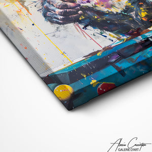 Associant l'art à la culture populaire, ce tableau d'un singe jouant au billard est une œuvre pleine d'esprit et de créativité, parfaite pour un espace de loisirs ou un salon contemporain.