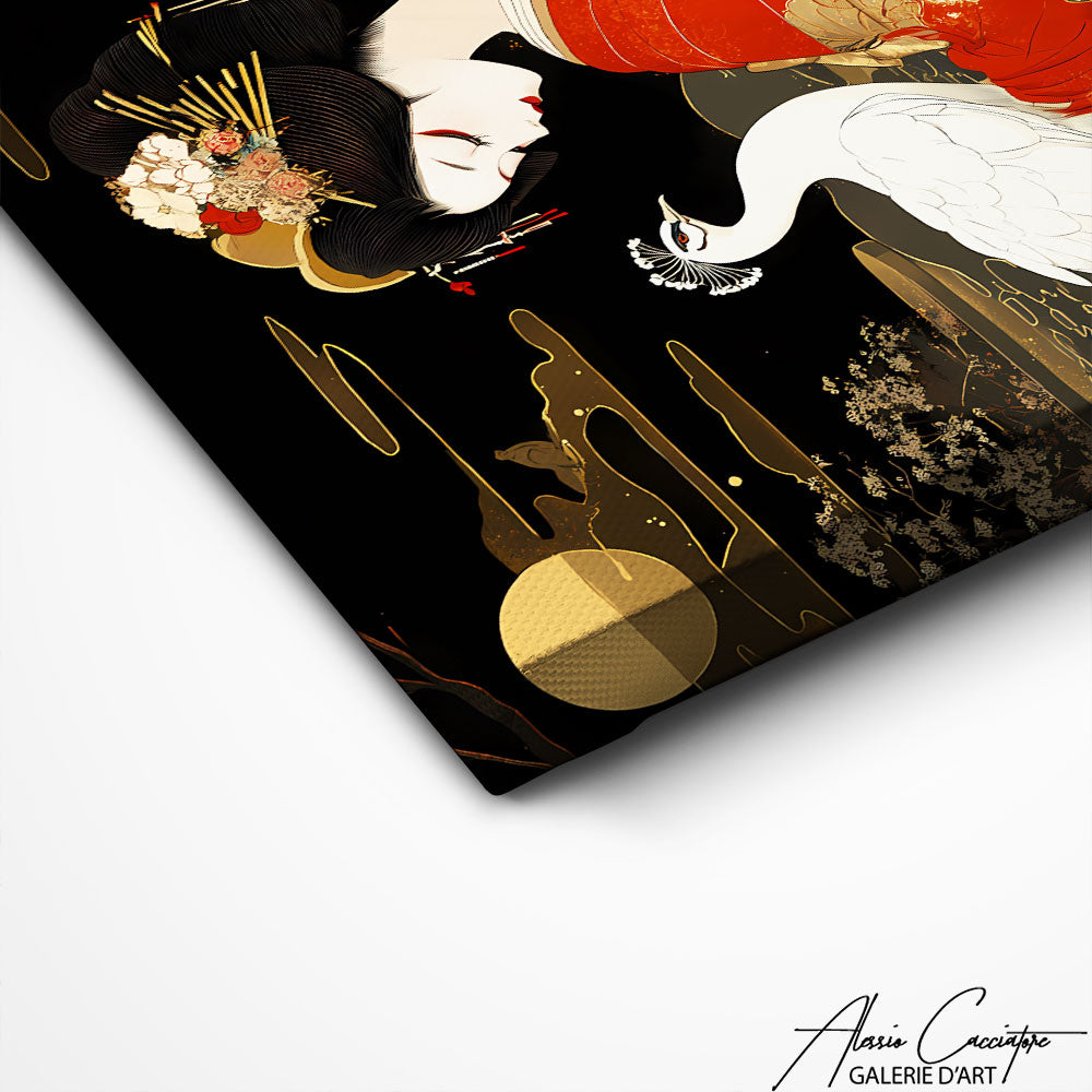 Notre tableau représente une femme japonaise vêtue d’un kimono rouge, accompagnée d’un paon blanc aux plumes détaillées. La scène se déroule de nuit, sous une lune dorée, avec un décor finement illustré. Les contrastes entre le noir profond du fond et les tons or et rouges créent une ambiance calme et élégante. Un visuel raffiné qui attire immédiatement le regard par sa composition équilibrée.