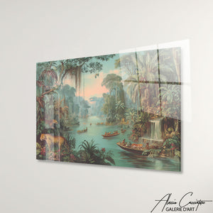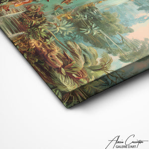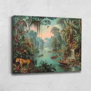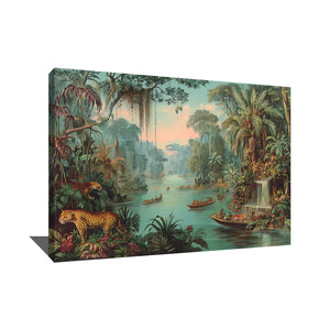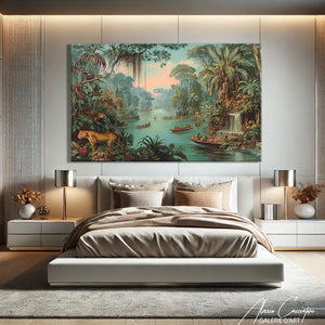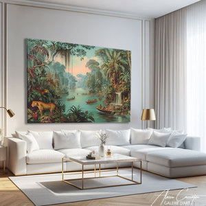 Notre tableau forêt amazonienne illustre une jungle luxuriante peuplée de jaguars et traversée par une rivière. Coloré et vivant, il respire exotisme et aventure. Idéal pour une décoration inspirante et audacieuse.