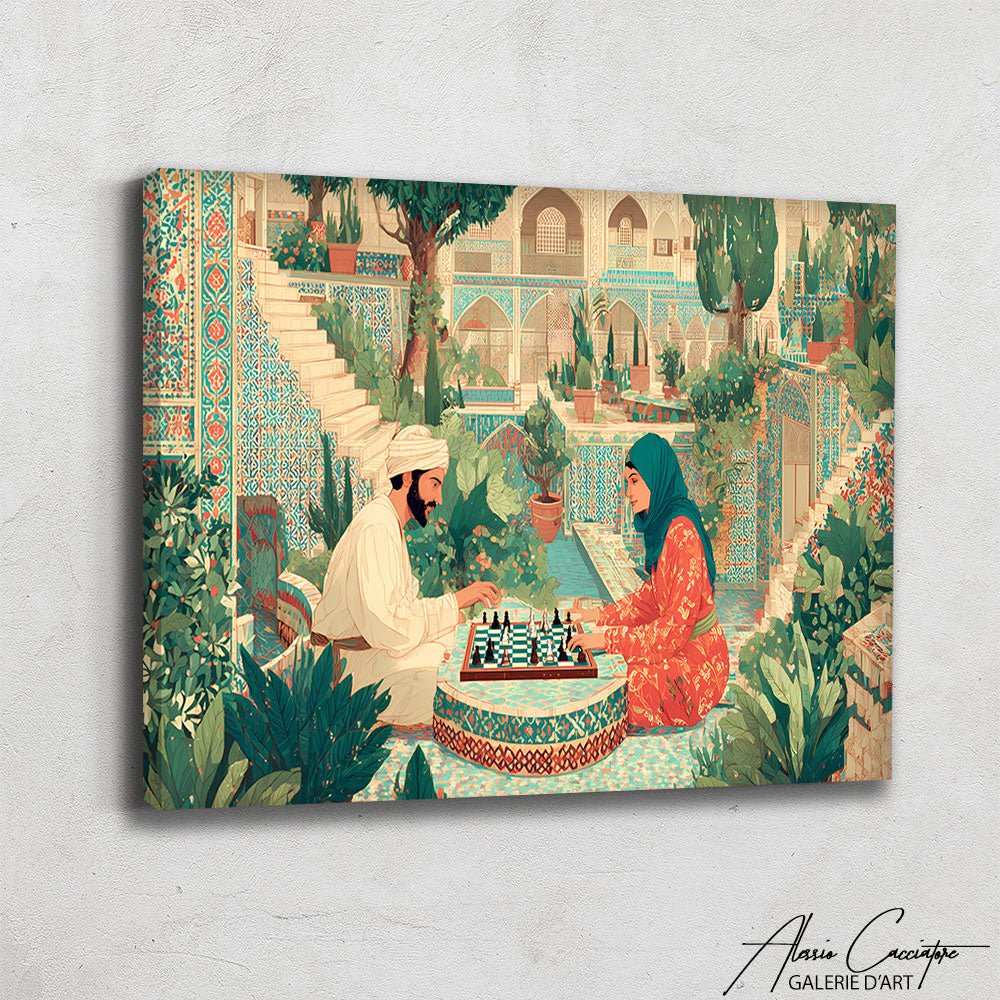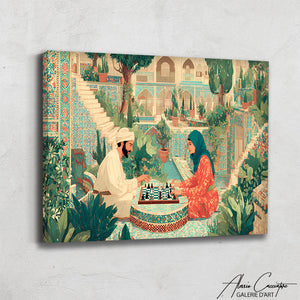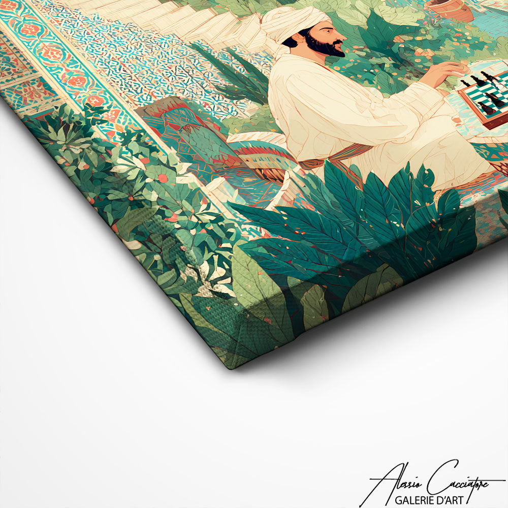 Notre tableau persan illustre tout le raffinement de la culture iranienne, avec des motifs floraux et architecturaux aux teintes délicates. Une œuvre élégante qui évoque un monde ancestral et poétique.