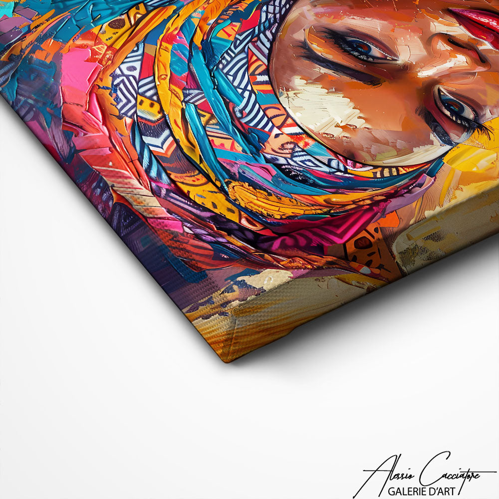 Notre tableau africain contemporain mélange audacieusement des motifs traditionnels avec des éléments modernes, créant cette femme africaine. Il est idéal pour ceux qui désirent apporter du caractère à leur intérieur