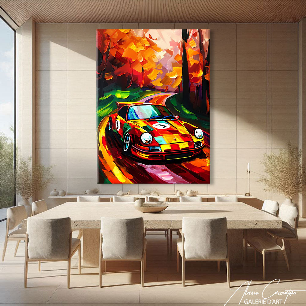 Notre tableau Porsche 911 célèbre l'élégance et la puissance de la voiture avec un style artistique unique. Parfaite pour habiller un mur, elle associe sophistication et passion automobile.