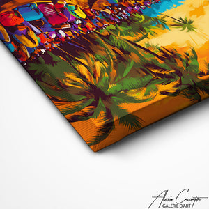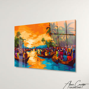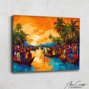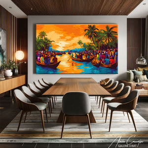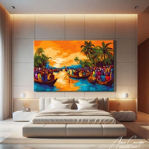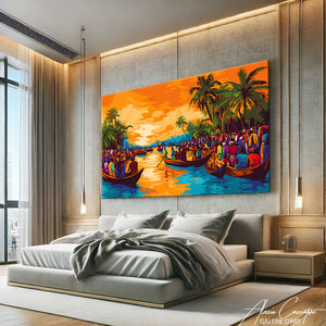 Our Africa painting depicts an African landscape with colorful boats sailing on the water. Abstract and expressive, it evokes travel and culture. A perfect piece to enhance your decor with originality.