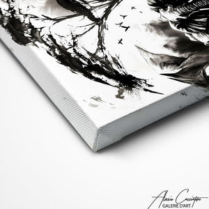 Our black and white African animal painting depicts elephants in the savannah. A simple yet powerful composition that exudes majesty and elegance. Perfect for a timeless and refined decor.