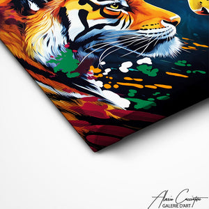Our modern animal painting captures another striking tiger-leopard duel! This majestic work transforms your space into an artistic treasure trove. Feline beauty enhanced by modern contemporary art. Pure animal emotion that instantly captivates and impresses!
