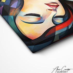 Our painting depicts a woman in a striking cubist style, where geometric shapes overlap to reveal a face that is both strong and mysterious. The vivid colors and sharp angles offer a modern and expressive interpretation of femininity. This painting draws the eye and intrigues with its abstract beauty.
