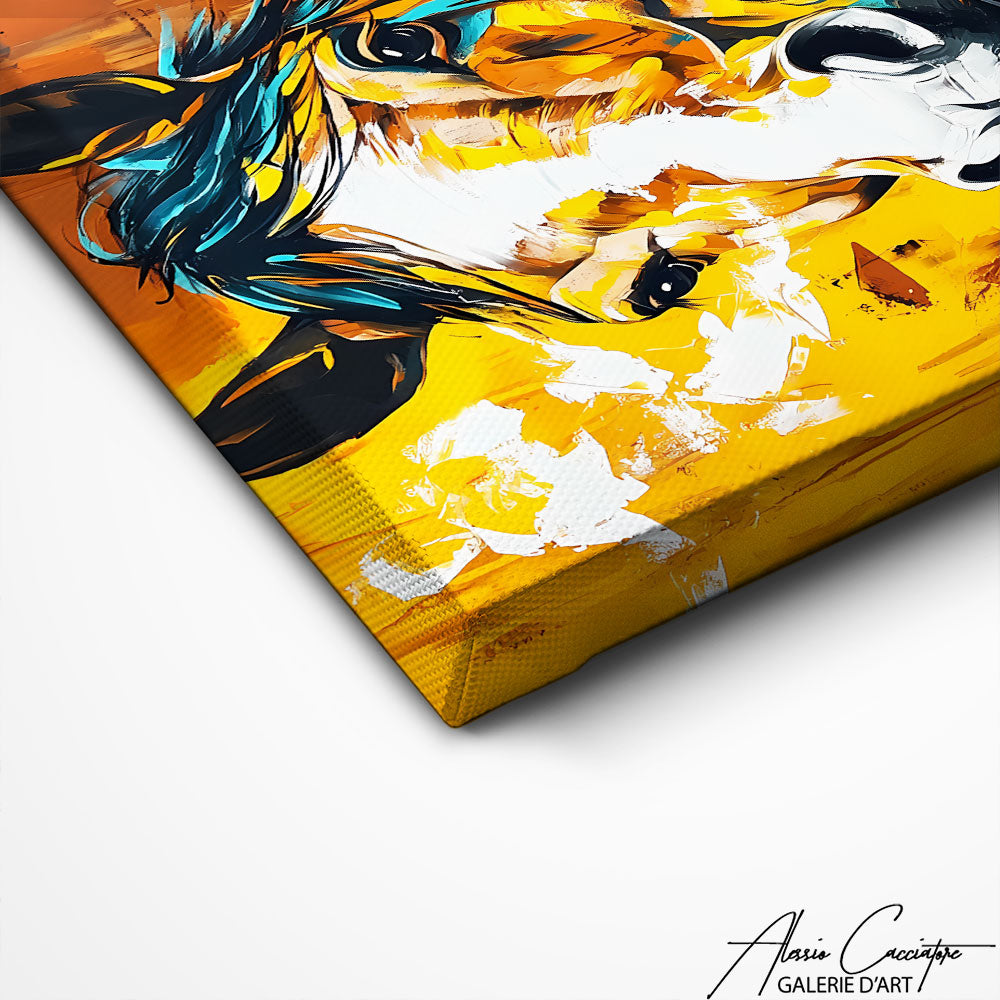 Notre Tableau Cheval Cigare représente un cheval en costume, cigare à la bouche, dans un style artistique affirmé et audacieux. Les couleurs intenses et le contraste puissant donnent un caractère unique et décalé à votre décoration. Parfait pour ceux qui aiment les œuvres amusantes, originales et pleines de personnalité. Une pièce forte qui devient immédiatement le centre de l’attention.