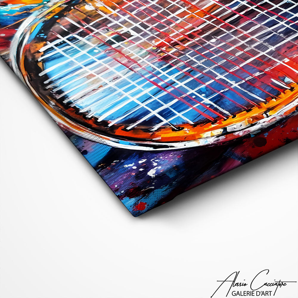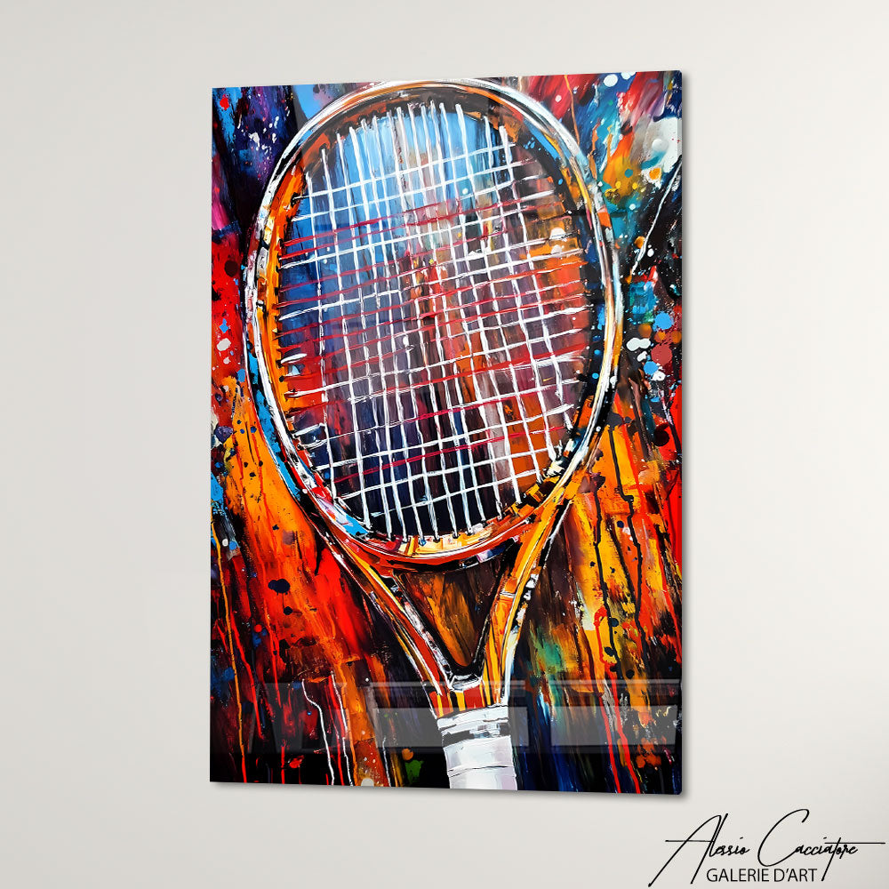 L'artiste met en avant une raquette de tennis sur un fond explosif de couleurs pour son tableau street art. Le mélange entre sport et esthétique graffiti donne une composition originale et énergique. Parfait pour une décoration moderne, sportive et audacieuse.