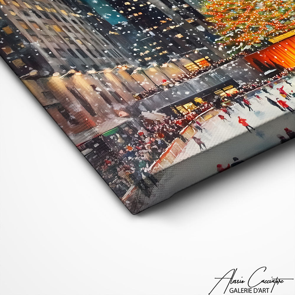 Notre Tableau Ambiance Noël illustre la célèbre patinoire du Rockefeller Center sous la neige, illuminée par un immense sapin de Noël. La scène chaleureuse et festive apporte une ambiance réconfortante, parfaite pour transformer votre espace en un lieu accueillant. Une création qui enrichit naturellement votre décoration.