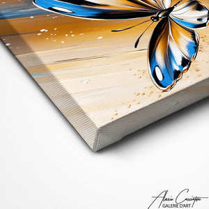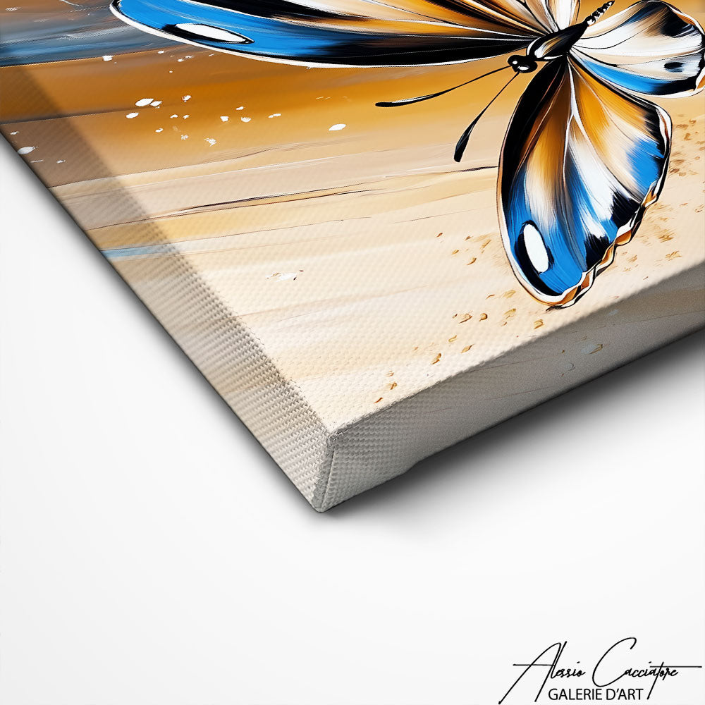 Notre tableau papillon doré revisite la beauté naturelle avec un style moderne et raffiné. Les tons de cuivre, de bleu et de blanc se fondent dans une composition fluide et équilibrée. Le papillon, au centre de la scène, évoque l’élégance et la légèreté dans un décor contemporain. Une création idéale pour sublimer une pièce avec une touche artistique distinguée.
