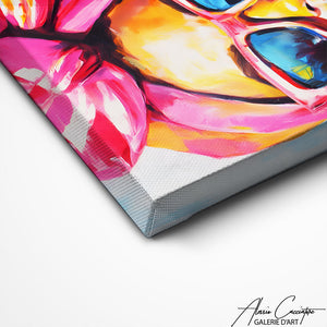 Our painting depicts a boldly styled Black woman with elegant hair and large, funky sunglasses. The vibrant colors and striking contrasts give her a look that's modern, proud, and full of personality. This painting embodies the fusion of African culture and contemporary urban spirit. Ideal for energizing an interior with character, originality, and energy.