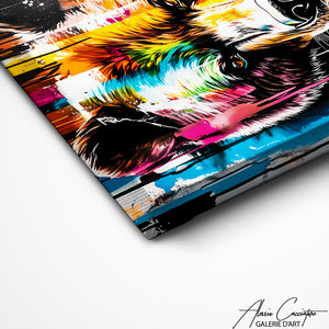 Notre tableau représente un ours vu de face, le regard intense et parfaitement centré. Des coulures multicolores traversent son pelage, créant un contraste fort avec le fond sombre. Les détails du museau et des yeux renforcent la puissance de l’animal. L’ensemble mélange force sauvage et esthétique pop urbaine.
