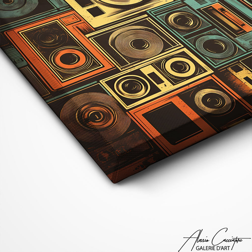 Notre tableau affiche une composition rétro de cassettes, haut-parleurs et éléments audio dans des couleurs vives et typées années 80. Le style graphique apporte une touche nostalgique parfaite pour les amateurs de musique et de décoration vintage. Idéal pour un salon, un studio ou une chambre au style pop rétro. Une œuvre pleine d’énergie et de personnalité.