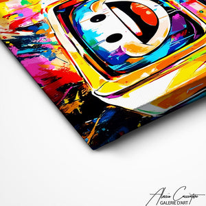 Notre tableau met en scène un ordinateur rétro au sourire exagéré, traité dans un univers pop art. Les couleurs éclatantes et les coulures assumées renforcent l’aspect décalé et ludique de la scène. Le contraste entre la technologie ancienne et l’expression joyeuse crée un visuel immédiatement accrocheur. Idéal pour dynamiser un intérieur moderne ou un espace créatif.