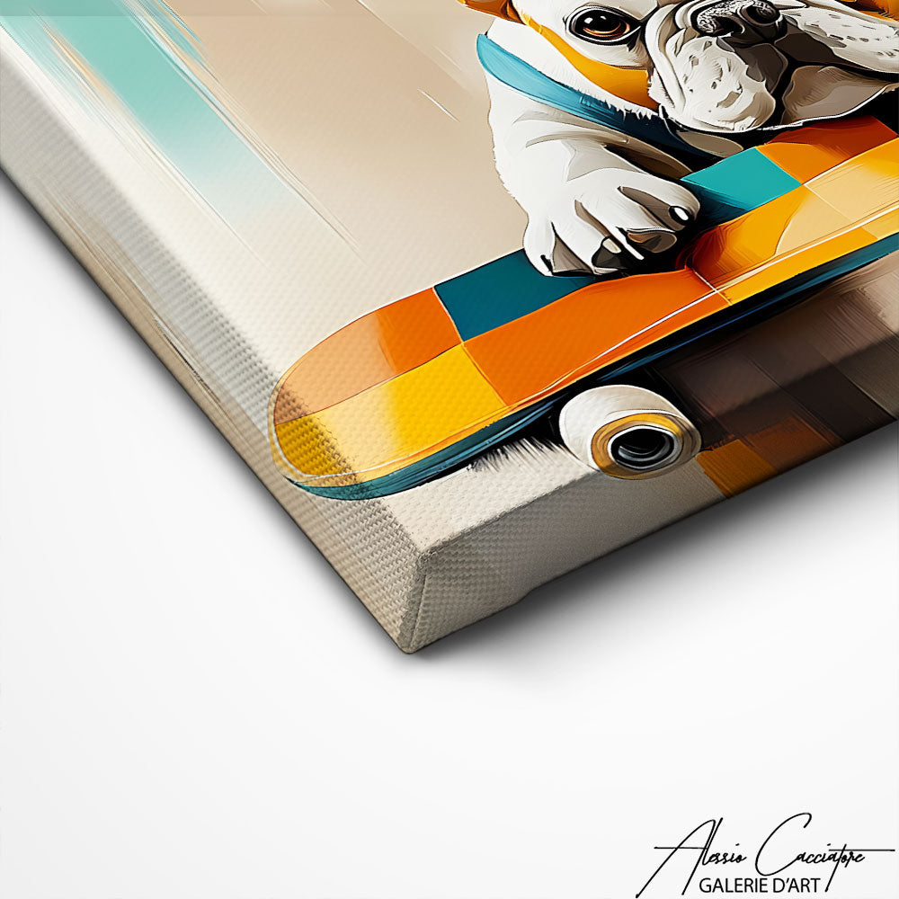 Avec notre tableau Chien Drôle, ajoutez une touche de bonne humeur à votre intérieur. Le bulldog sur son skateboard dégage un charme irrésistible qui attire immédiatement l’attention. Parfait pour une déco chaleureuse, moderne ou décalée. Un tableau qui fait sourire tout en embellissant votre espace.