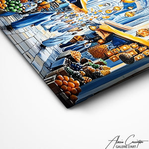 Notre tableau décoration bleu capture la beauté des souks orientaux avec leurs lumières suspendues et leur architecture raffinée. Les nuances bleues et dorées créent une atmosphère apaisante et élégante. Idéal pour sublimer un espace de détente ou un salon, il évoque voyage et raffinement.