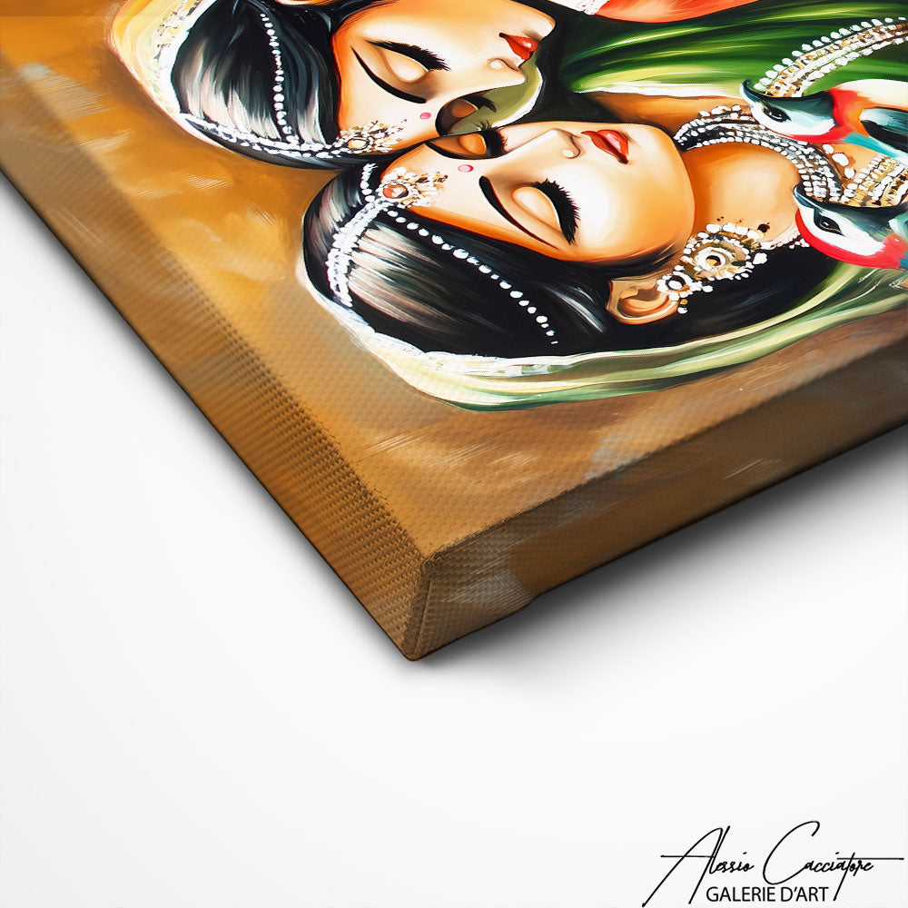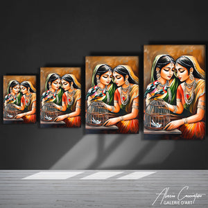 Notre tableau féminin hindou met en lumière la douceur et la complicité féminine. Les deux femmes, entourées d’oiseaux et de couleurs chaudes, évoquent la paix, la bienveillance et la beauté du quotidien. Ce tableau séduit par son atmosphère poétique et apaisante, parfait pour une ambiance élégante et zen. Réalisée sur toile premium, cette œuvre combine harmonie et émotion.