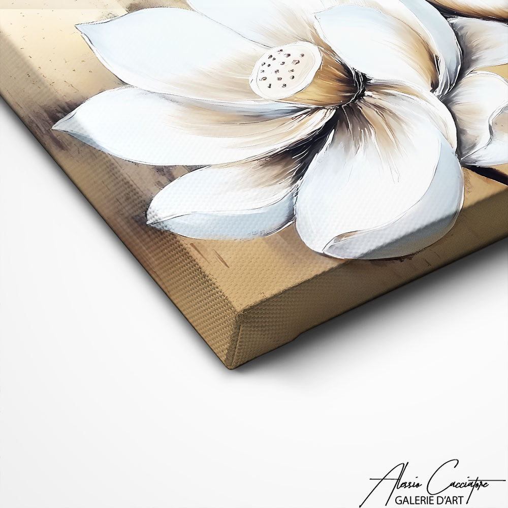 Notre tableau fleurs de lotus réunit deux fleurs épanouies sur un fond doré délicat, symbole d’union et de calme intérieur. Les nuances crème et or se fondent avec douceur pour créer une ambiance luxueuse et apaisante. Parfait pour une décoration zen et raffinée, il évoque la beauté simple et l’équilibre spirituel.