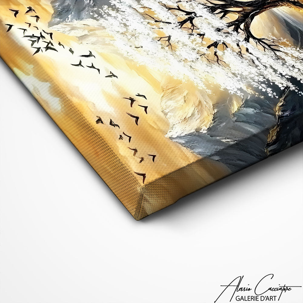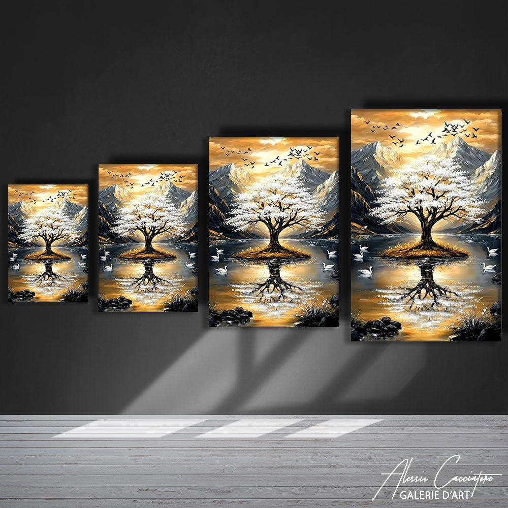 Notre tableau japonais arbre évoque la renaissance et l’équilibre. Un arbre en fleurs se dresse au centre d’un lac paisible, entouré de montagnes et de cygnes. Sa beauté symétrique et lumineuse symbolise la perfection naturelle. Ce tableau s’intègre merveilleusement dans une décoration zen, minimaliste ou contemporaine.