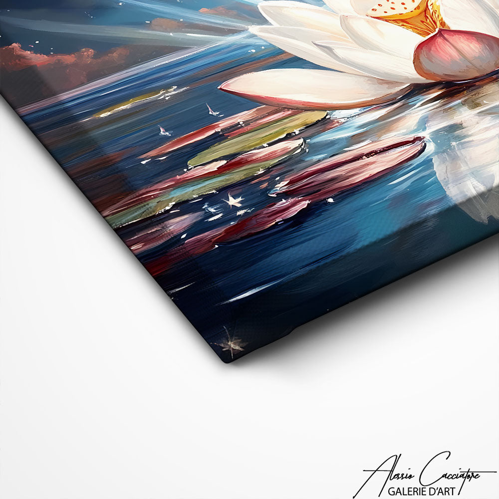 Notre tableau lotus bleu capture un moment suspendu où la fleur émerge dans un jeu de lumière céleste. Ses pétales semblent briller sous les étoiles, offrant une atmosphère à la fois mystique et apaisante. Parfait pour créer une décoration élégante et spirituelle, ce tableau évoque la sagesse et la paix intérieure.
