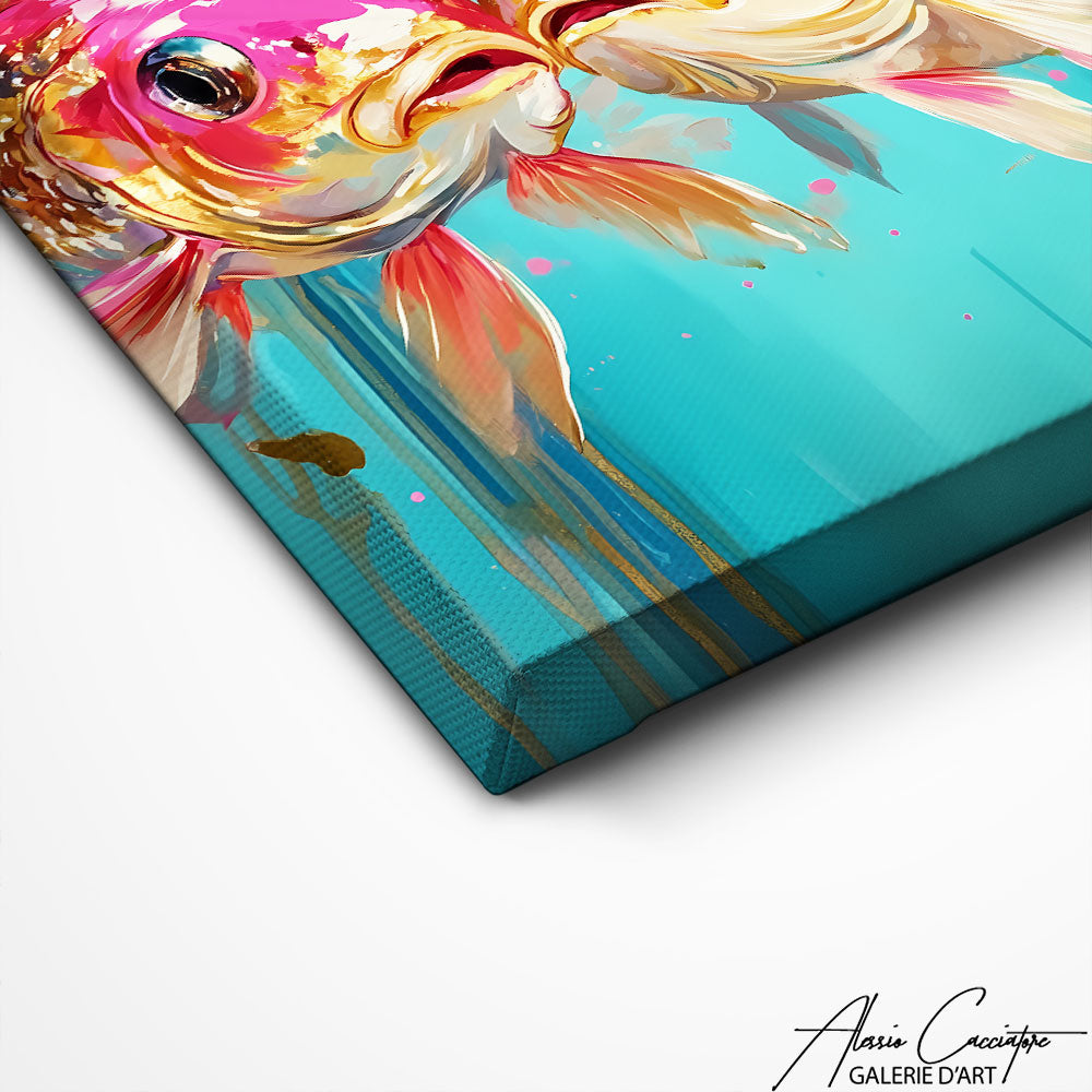 Notre tableau moderne avec des poissons associe l’art abstrait à la beauté naturelle. Les touches dorées et turquoise créent une ambiance luxueuse et apaisante. Les poissons semblent flotter dans une lumière liquide, symbole de prospérité et d’équilibre.