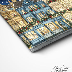 Notre tableau paysage hivernale représente une charmante rue enneigée bordée de maisons colorées décorées pour les fêtes. L’atmosphère douce et poétique de la scène crée un sentiment de sérénité dans votre pièce. Un choix élégant pour sublimer votre environnement.