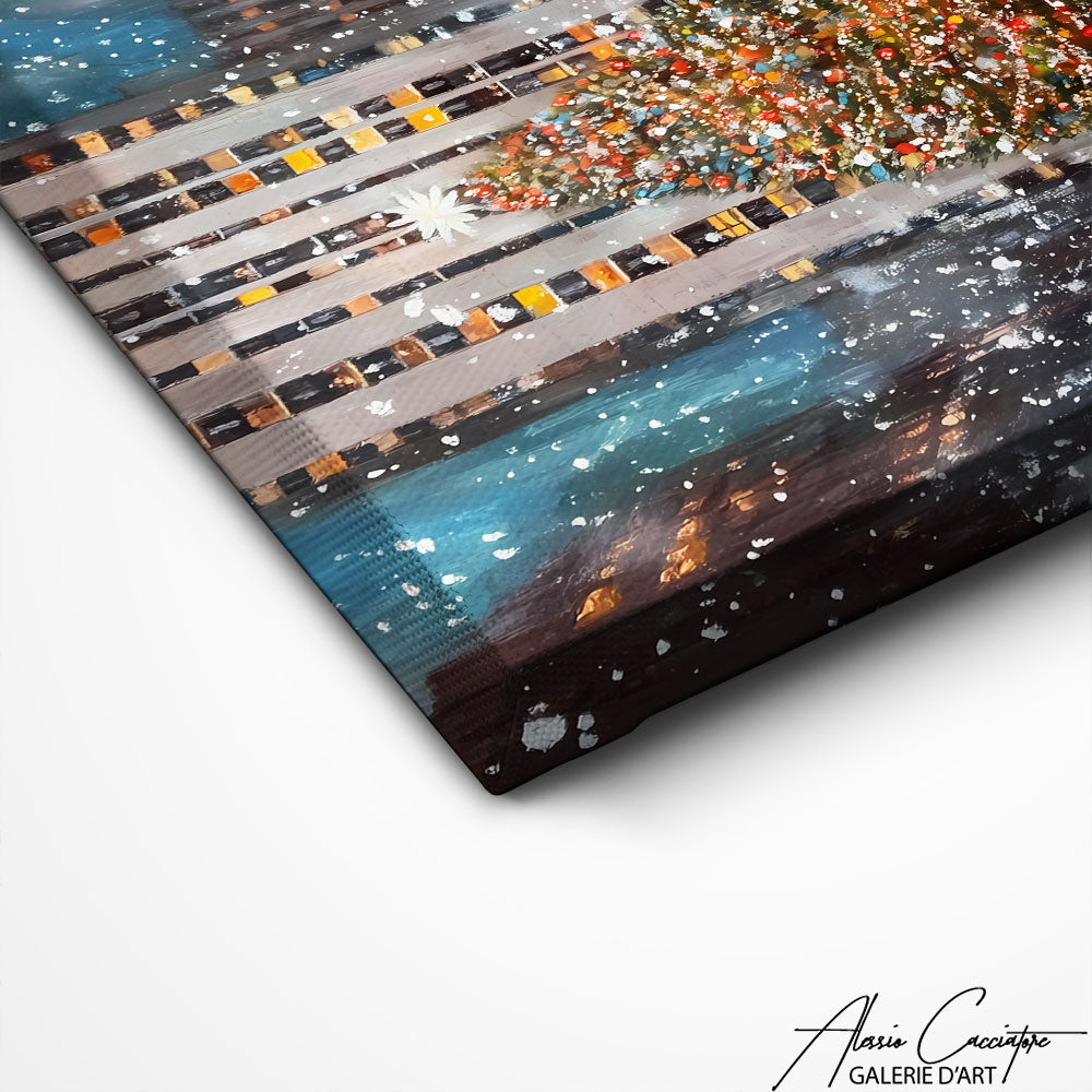Illustrant une patinoire entourée de gratte-ciel et d’un immense sapin illuminé, notre tableau sapin de Noël transforme votre espace en scène festive new-yorkaise. Les couleurs chaudes et les touches de neige créent une ambiance chaleureuse et pleine de magie. Il apporte immédiatement du caractère à une pièce. Une vraie invitation aux fêtes et aux souvenirs.