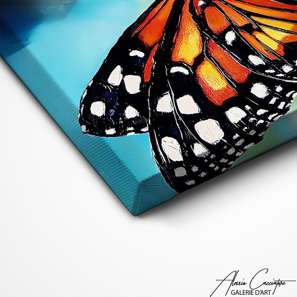 Notre tableau papillon fleur capture un instant délicat où un papillon se pose sur une fleur dorée. Les teintes lumineuses de jaune et d’orange se mêlent au bleu du ciel, offrant une scène à la fois douce et joyeuse. Parfait pour illuminer un salon ou une chambre, ce modèle évoque la beauté de la nature et la légèreté du moment présent. Une œuvre pleine de poésie qui apporte une touche d’harmonie à votre décoration.