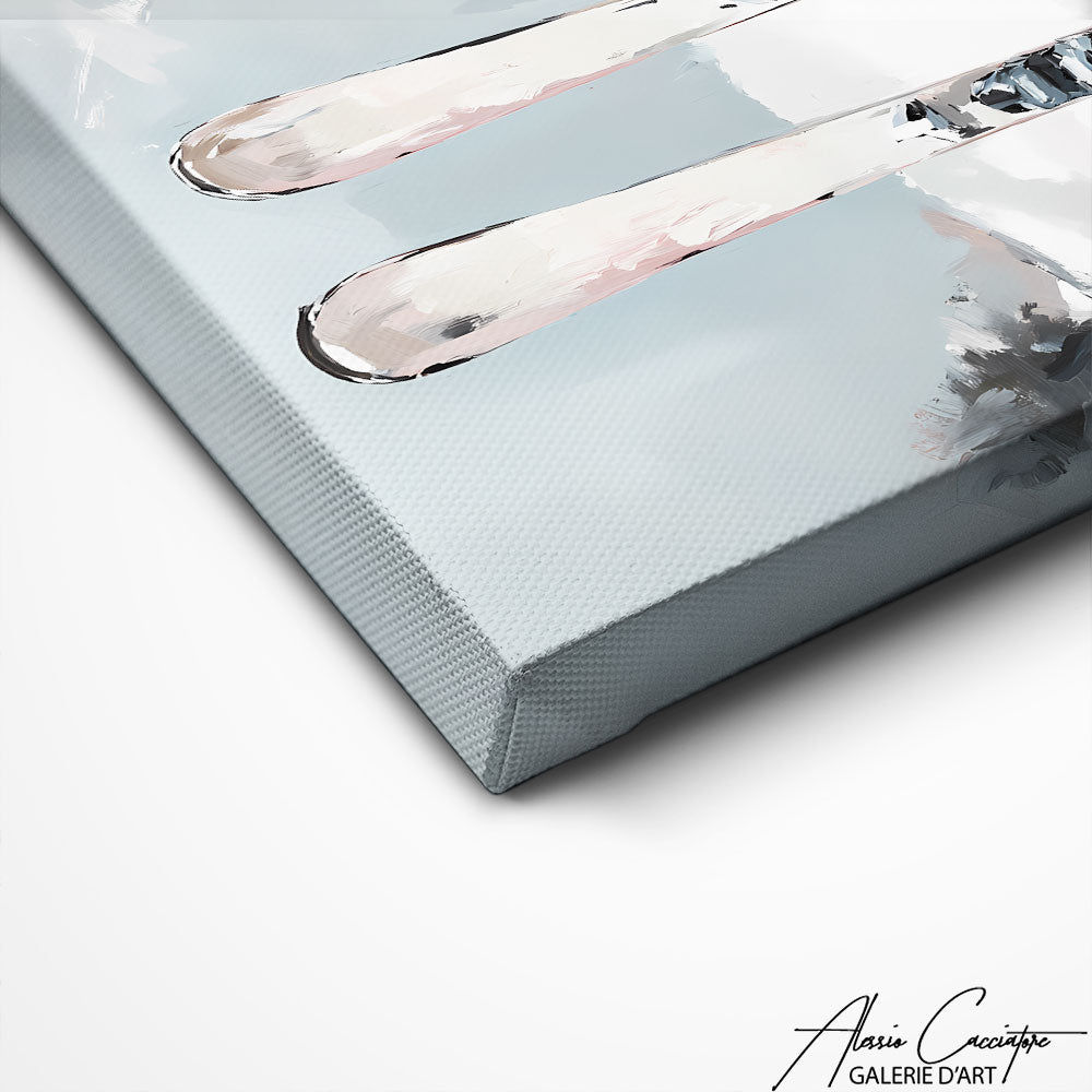 Cette œuvre met en scène une paire de skis plantée dans une neige fraîche, dans un décor hivernal doux et épuré. Les teintes blanches et grises créent une ambiance apaisante rappelant les paysages de montagne. Parfait pour les passionnés de sports d’hiver ou les intérieurs recherchant une touche de fraîcheur. Ce tableau apporte instantanément une sensation de sérénité et d’évasion.