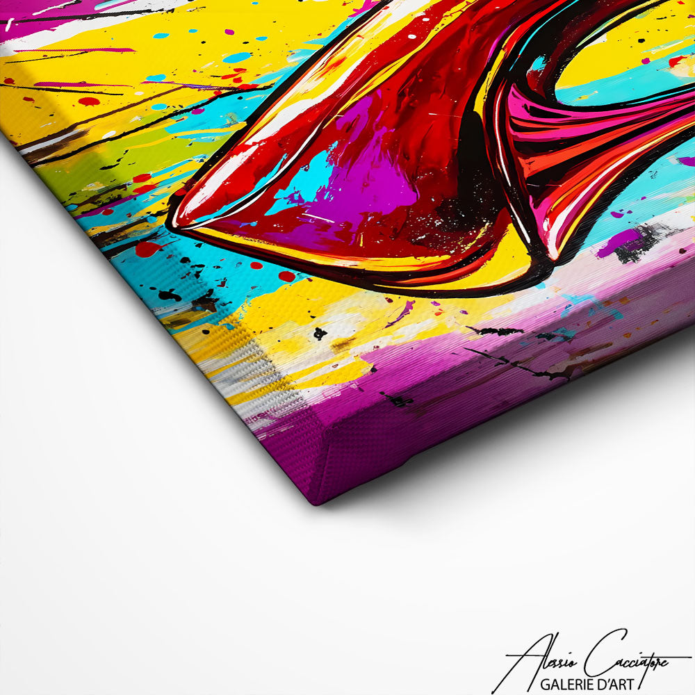 Notre tableau met en scène un escarpin rouge brillant vu de profil. La chaussure devant un fond éclaboussé de couleurs vives. Les lignes fluides et les reflets accentuent l’élégance du talon. Le contraste entre mode et art urbain crée un visuel fort et moderne.