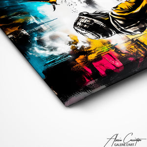 Notre tableau distingue une enfant vue de dos, vêtue d’un manteau et d’un bonnet, face à un ciel tourmenté. Un oiseau en plein vol attire son regard tandis qu’un bocal lumineux repose au sol. Les couleurs vives se mêlent à des zones plus sombres, créant une forte tension visuelle. La scène évoque l’innocence confrontée à un univers urbain chaotique.