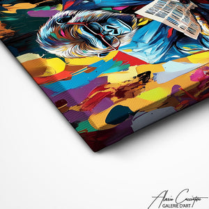Un gorille habillé d’un costume élégant est assis, concentré sur un journal tenu entre ses mains. Le contraste entre l’animal et l’attitude humaine crée une scène forte et ironique. Les traits du visage sont expressifs et précis, renforçant le caractère du sujet. Le fond coloré accentue la présence centrale du personnage.