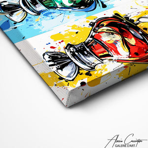 Quatre flacons colorés disposés en grille, chacun avec une teinte différente et des éclaboussures dynamiques. Les formes arrondies et les contrastes francs donnent un rendu très visuel et moderne. L’ensemble joue sur la répétition et la couleur pour créer un effet pop immédiat. Un tableau décoratif, énergique et facile à intégrer dans un intérieur contemporain.