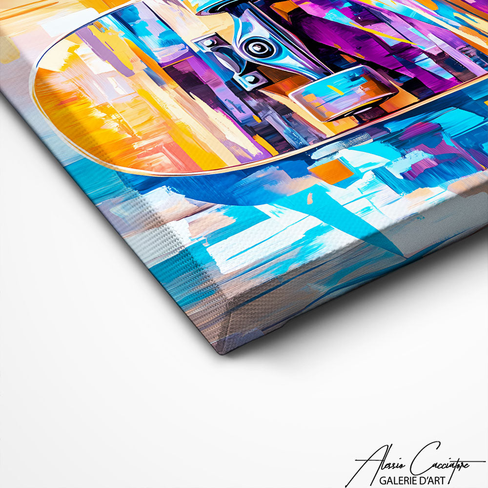 Notre tableau skate, une création moderne qui met en scène une planche colorée dans un univers artistique plein d’énergie. Les nuances dynamiques et les détails soignés apportent un style urbain affirmé, idéal pour personnaliser un salon, une chambre ou un espace créatif. Chaque élément de la scène évoque l’esprit libre du skate et transforme votre décoration en une véritable expression de caractère.