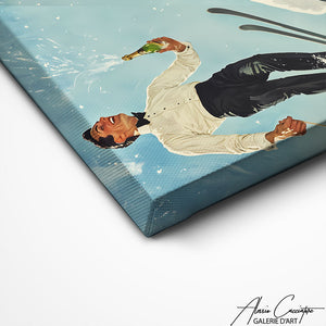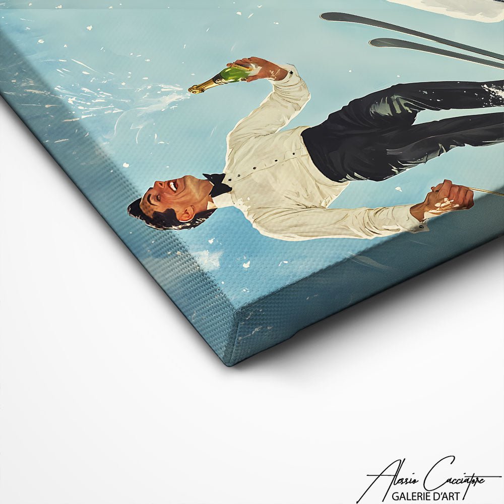 Notre tableau capture l’élégance d’un skieur réalisant un saut spectaculaire, bouteille de champagne à la main, dans une ambiance rétro chic. L’ensemble dégage une atmosphère festive, idéale pour donner du caractère à une pièce. Les couleurs douces de l’hiver contrastent parfaitement avec la scène dynamique. Une décoration originale qui apporte humour et sophistication à votre intérieur.