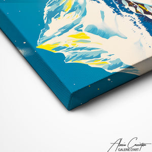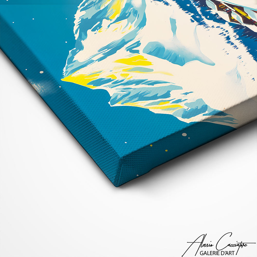 Notre création au style vintage représente une descente à ski typique des anciennes affiches touristiques. Les tons éclatants et la composition rétro évoquent les premières heures des sports d’hiver. Elle apporte instantanément une touche nostalgique et chaleureuse à votre décoration. Un choix parfait pour sublimer un chalet ou un espace inspiré par la montagne.