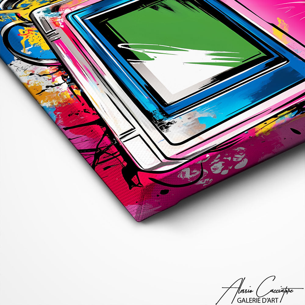 Notre tableau représente une console de jeu rétro rose, traitée dans un style urbain. Les contours épais et les éclaboussures de couleurs donnent une impression d’énergie brute. L’écran vert contraste fortement avec les teintes roses, jaunes et bleues du fond. L’ensemble évoque la culture gaming revisitée par le street art contemporain.