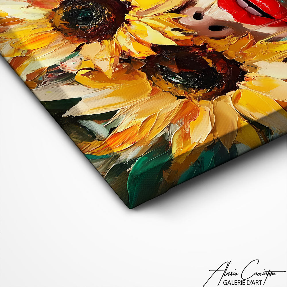 Notre tableau tournesol moderne capture toute la beauté du contraste entre nature et modernité. Les pétales dorés encadrant un visage expressif créent une œuvre audacieuse. Idéal pour un intérieur contemporain, ce tableau attire le regard et diffuse une atmosphère artistique unique.