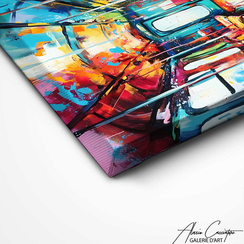 Notre tableau urbain moderne dépeint un wagon de métro aux couleurs explosives, symbole du rythme et de la diversité de la vie citadine. Chaque détail respire l’énergie urbaine et la créativité artistique. Idéal pour une décoration audacieuse et colorée, il transforme votre espace en scène moderne.