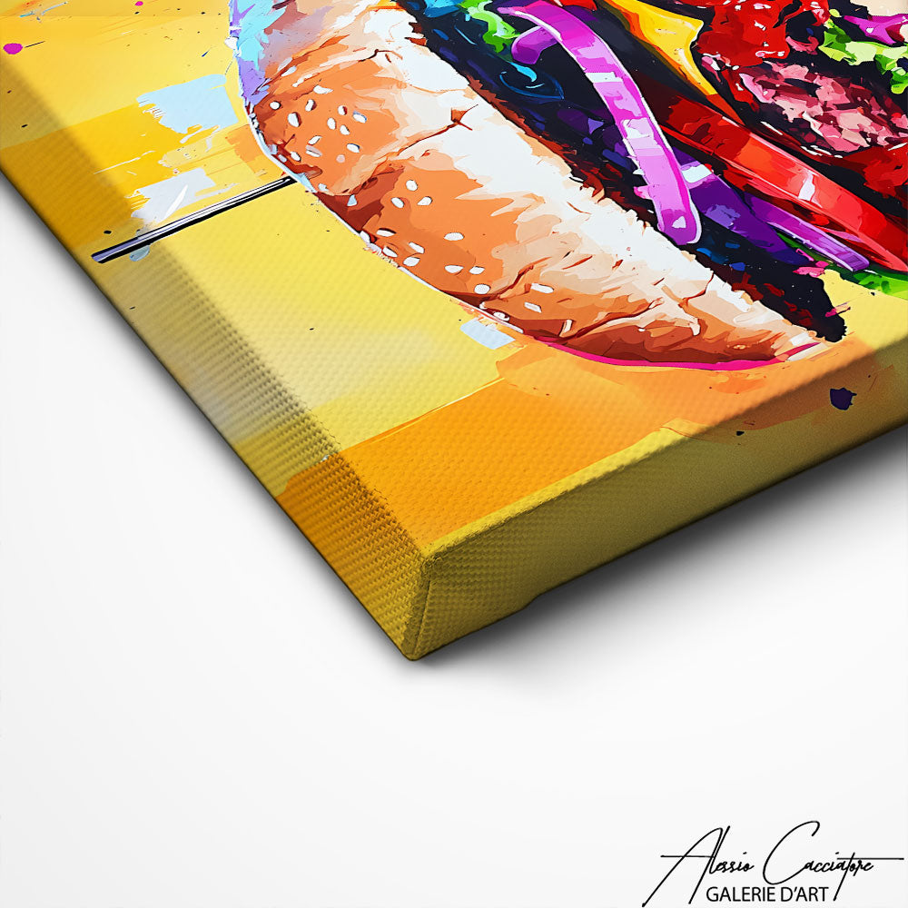 Notre tableau représente un burger composé de couches généreuses et très détaillées. Le pain, la viande, le fromage et les garnitures sont exagérés pour créer un effet spectaculaire. Les couleurs éclatées et les projections donnent une impression de mouvement et d’énergie. Une pièce gourmande et audacieuse qui attire immédiatement l’attention.