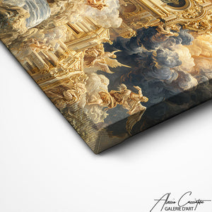 Our antique painting depicts a celestial temple in a majestic Baroque style, with monumental columns, golden clouds, and architecture bathed in divine light. The overall effect exudes a sense of grandeur, spirituality, and refinement. Perfect for theatrical settings or those inspired by the great classical decors, this painting creates a solemn and spectacular atmosphere, worthy of a sacred palace.
