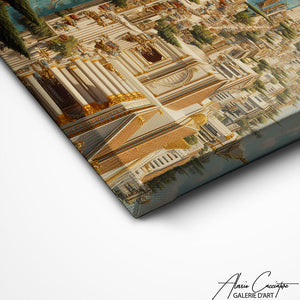 Our antique landscape painting depicts an ancient Greek city, with its majestic columns, light-colored stone buildings, and Mediterranean surroundings bathed in light. The atmosphere is peaceful and steeped in history, as if frozen in time. Perfect for classic, cultural, or vintage decor. This painting invites you on a journey through the grandeur of ancient Greece.