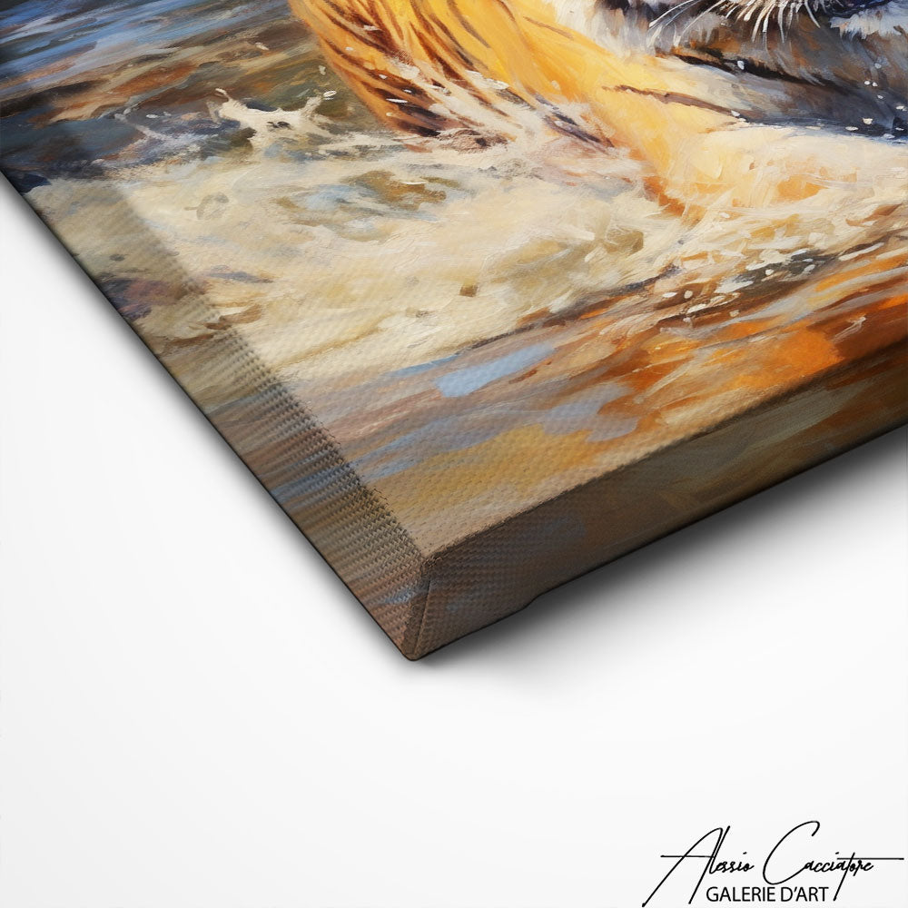 Dominant and imposing, this large tiger painting brings a vibrant presence to any space. The fine detail and vivid color capture the essence of this majestic animal, transforming your space into a personal art gallery.