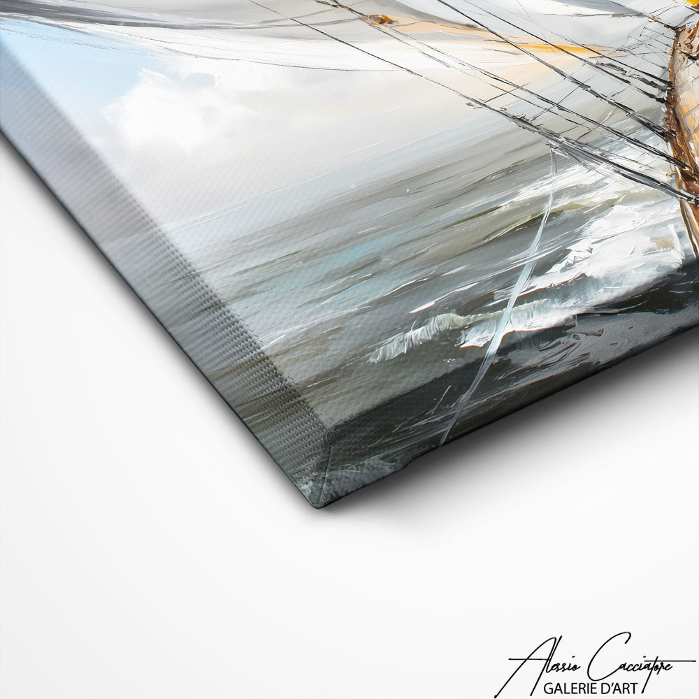 Notre tableau bateau illustre un voilier glissant sur les flots dans une lumière dorée. Raffiné et apaisant, il symbolise aventure et élégance. Une pièce idéale pour apporter prestige et calme à votre intérieur.