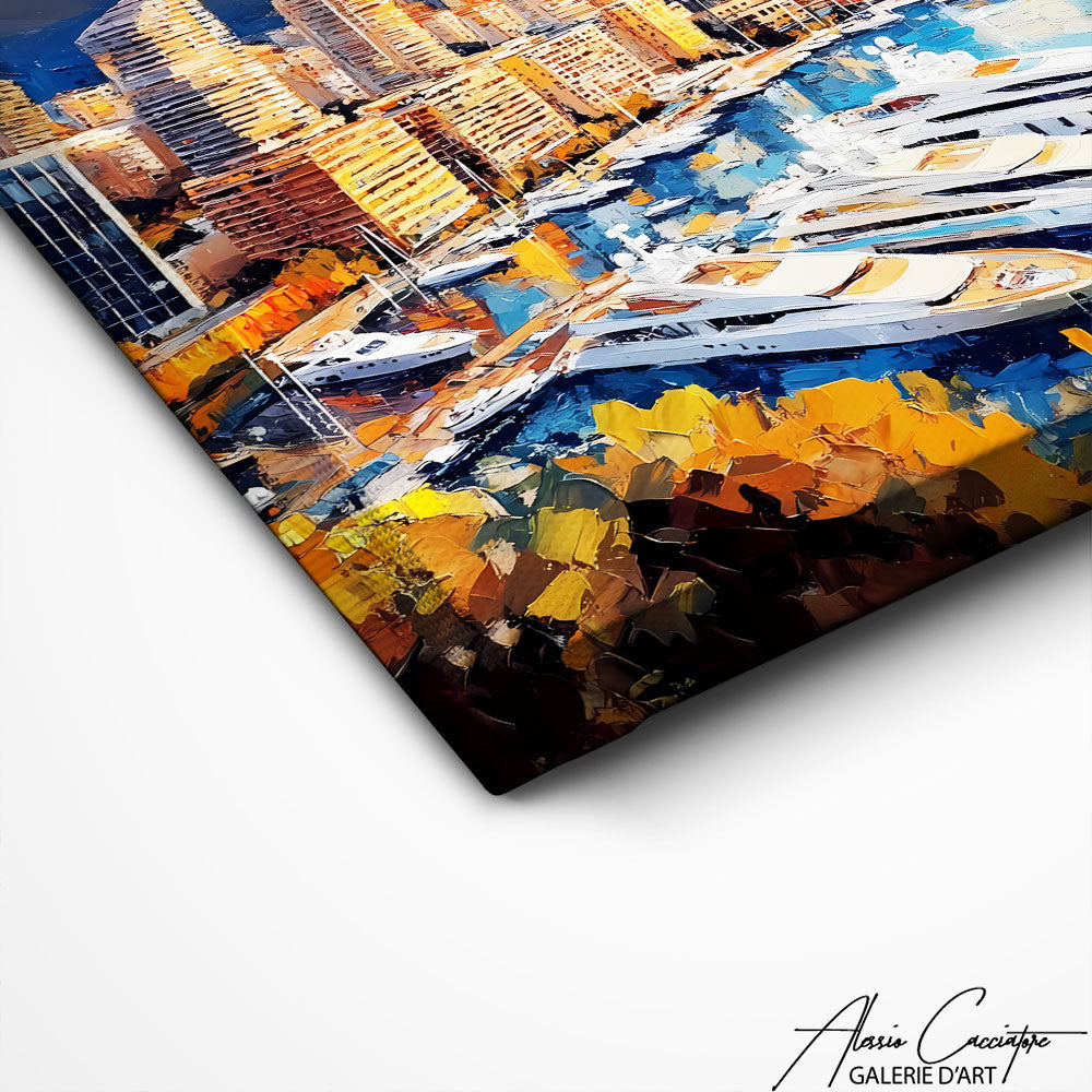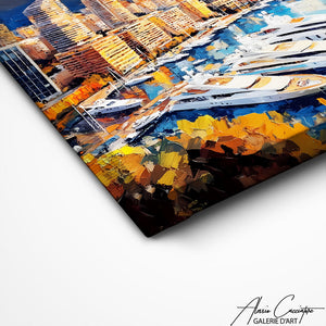 L’élégance des yachts et la lumière du soir se rencontrent dans notre tableau maritime empreint de luxe. Le soleil couchant baigne la mer d’un éclat doré, tandis que la ville en arrière-plan révèle toute sa splendeur. Idéal pour une décoration moderne, il évoque les voyages, la réussite et la liberté.