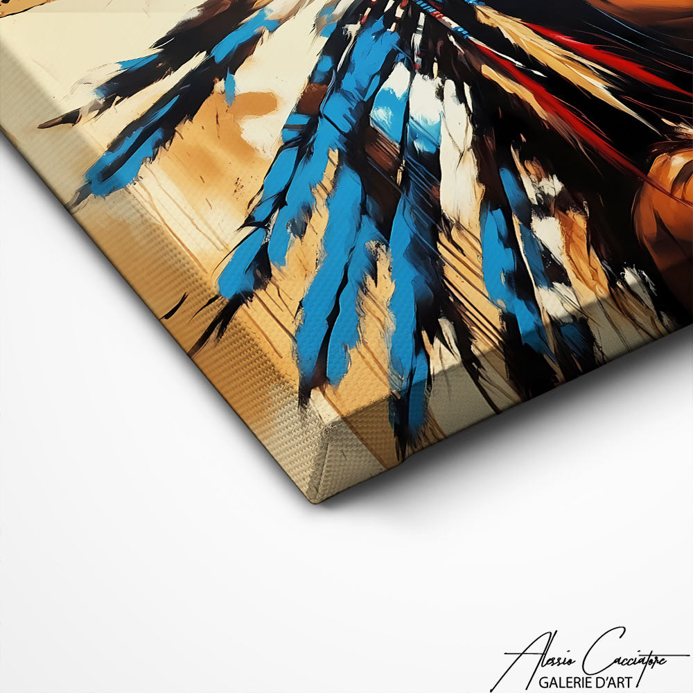 Our painting captures the soul and intensity of a Native American face, highlighting the history and depth of the gaze. Every detail, from the facial features to the traditional ornaments, reflects the pride and cultural richness of Native Americans. This painting blends perfectly into a modern or ethnic decor, bringing a unique artistic and spiritual touch.