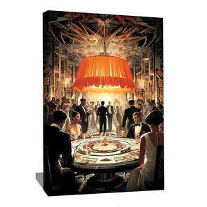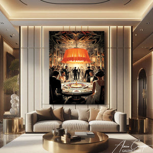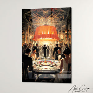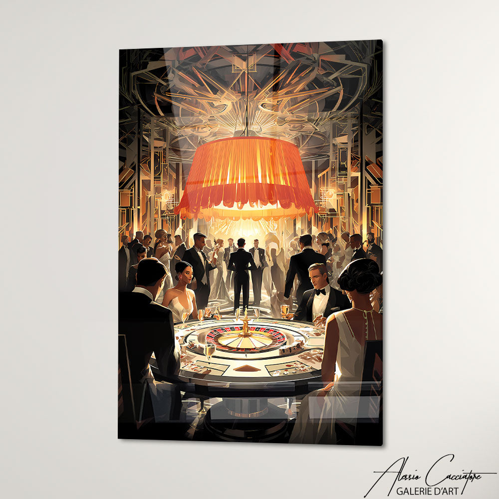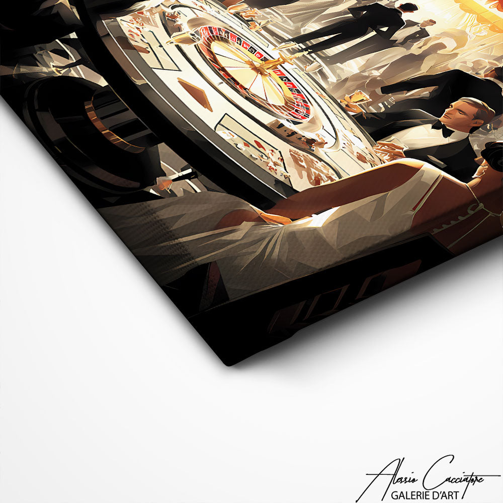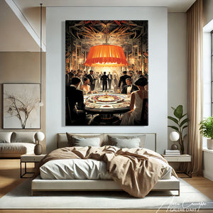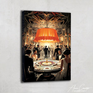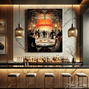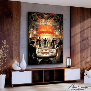 Our Art Deco Casino Roulette painting depicts a refined casino with tuxedoed players. Elegant and festive, it exudes glamour and exclusivity. An ideal piece to add prestige and luxury to your home.
