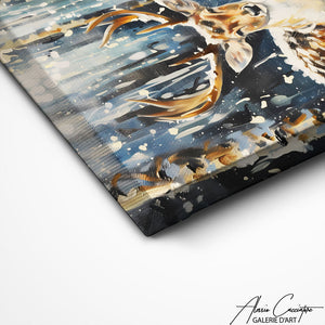 This deer in the snow painting captures the majesty of the animal in the middle of winter, surrounded by a snowy landscape. Ideal for a peaceful and natural atmosphere, it adds a touch of calm and grandeur to your decoration.