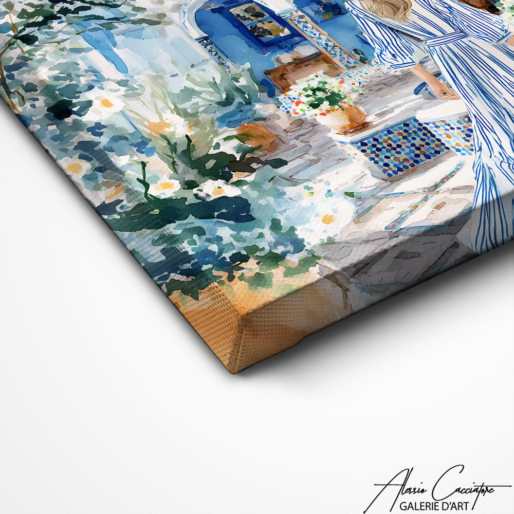 Our bohemian chic painting depicts a woman in a summer dress, seen from behind, wearing a hat in an abstract blue oriental landscape. Soft and poetic, it evokes travel and escape. Perfect for adding charm and elegance to your walls.