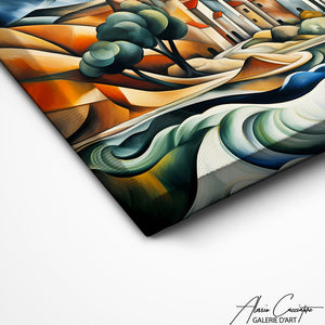 This landscape, seen through the prism of cubism, transforms nature into a kaleidoscope of shapes and colors, offering a renewed and vibrant vision of the natural environment to this cubism landscape painting.